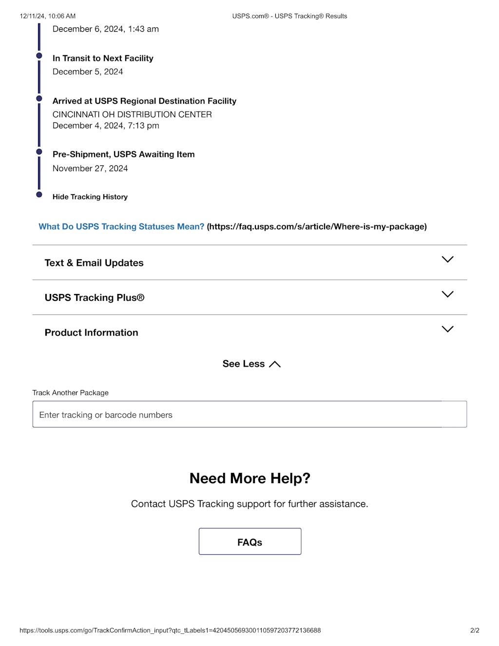Your item was delivered to the front desk, reception area, or mail room at 9:28 am on December 6, 2024 in OXFORD, OH 45056.